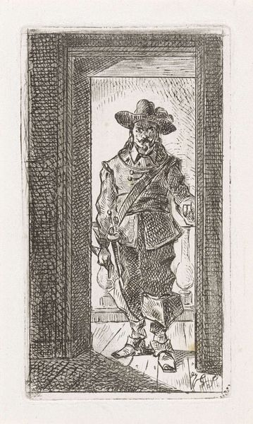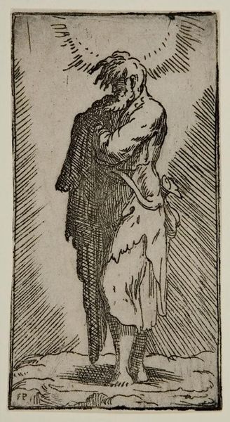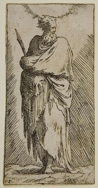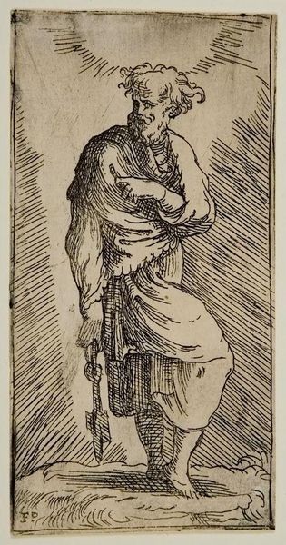 Curator: Here we see “Saint James Major,” an unsigned print currently residing at the Harvard Art Museums. Editor: There’s something very raw about it, almost like a sketch rather than a finished piece. The etched lines are so visible. Curator: Indeed. The printmaking process would have allowed for broader dissemination of this imagery. We must consider the social context of religious iconography. Editor: And the material realities of production. The tools, the plates, the paper—think of the labor involved. It's not just an image, but a crafted object. Curator: Exactly. It's about the intersection of craft, faith, and the politics of representation. Editor: It does have a striking presence, this Saint James Major. A testament to materials and beliefs intertwined.