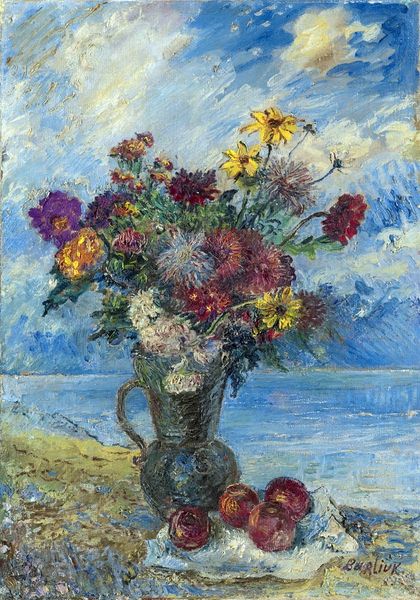 Curator: This watercolor on paper is titled "Poppies, Isles of Shoals 02." It was completed in 1891 by the American Impressionist painter Childe Hassam. Editor: It feels so airy and vibrant, almost like a fleeting moment captured in a burst of color. The layering creates a depth that I wasn't expecting. Curator: Hassam was quite fond of painting en plein air. One can certainly feel the presence of open-air landscape and, given the artwork's title, can perhaps see a coastal setting. The poppies might also reference his exploration of New England gardens at the time. I find it an interesting blend of fine art and what would traditionally be viewed as decorative or feminine craft. Editor: Yes, the formal arrangement of color—the contrast between the cool blues of the sea and sky and the warm reds and yellows of the poppies—creates a satisfying tension. Note, also, the gestural brushwork. The forms aren't tightly defined but instead suggest the texture of petals, foliage, and gentle ocean waves through sheer material qualities and compositional effects. Curator: Thinking about it now, the appeal goes beyond simple aesthetic pleasure; it’s tied to the rise of leisure culture. Depictions of gardens and the seaside become intertwined with notions of middle-class aspiration and a longing for simpler ways of life as industrialization marches on. Hassam had created an art for an emerging consumer class. Editor: That makes me appreciate the technical elements even more. See how the translucent layers of watercolor build up? The white of the paper itself remains visible in areas, creating luminous effects and enhancing the sense of atmosphere. It speaks to Hassam's skill in manipulating light through tonal relationships alone. Curator: Right. We see Hassam adapting and reinterpreting established landscape traditions in ways accessible to a broad audience while also celebrating a particular slice of American life, its burgeoning industry, and the leisure classes of his moment. It encapsulates so much in just a few brushstrokes. Editor: Ultimately, though, for me, it’s about the pure visual sensation—the vibrancy of the color, the lightness of touch. It remains an artwork that brings pleasure and contemplation with just the suggestion of forms.