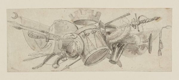 Curator: This is Thomas Stothard's "Standards, Trumpets and a Laurel Wreath. Design for a Tailpiece," currently held at the Tate. Editor: Oh, wow, chaotic symphony, isn't it? Like a marching band exploded on the page. Curator: Precisely. Stothard, who lived from 1755 to 1834, was a prolific illustrator. This preliminary sketch offers insight into the visual language of 18th-century military pageantry. Editor: There is a feeling of celebration but also of something lost in translation. The laurel wreath seems almost like an afterthought. Curator: Perhaps a commentary on the fleeting nature of glory, then? Or a reflection of the societal structures that upheld such spectacles? Editor: Maybe. Or it could just be a drawing of some trumpets. But isn't it more fun to pretend it's deeper than that? Curator: Indeed. Ultimately, the power of art lies in its ability to provoke such diverse interpretations. Editor: Well said! Let's go find something else to over-analyze.