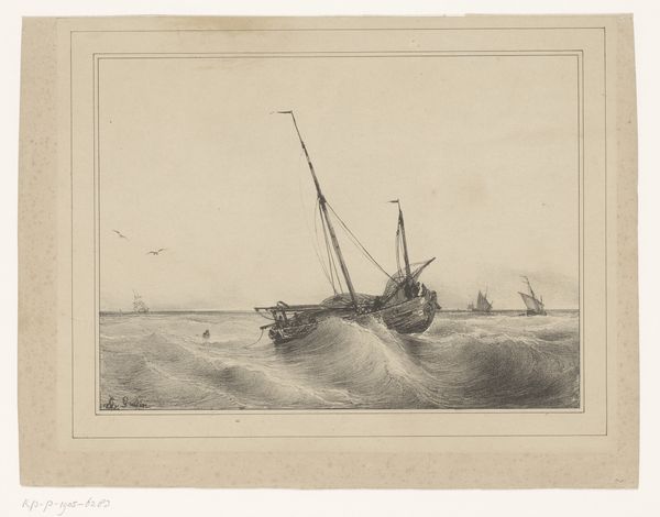 Cornelis Philippus Groebel Jr. created this print of ships on a rough sea sometime in the mid-19th century. During this period, maritime art was especially popular in the Netherlands, reflecting the nation's deep connection to the sea and its identity as a seafaring power. The turbulent waters and the small boat struggling against the waves evoke a sense of vulnerability. The figures in the boat, battling the elements, embody the daily struggles of ordinary people against forces beyond their control. Their gender and class are suggested by their plain dress and the nature of their labor, hinting at the social hierarchies of the time. The print seems to highlight the Dutch relationship with the sea, not as a source of wealth and power, but as a site of unpredictable danger and relentless struggle. It invites us to reflect on our own relationship with the environment. How do we navigate the challenges and uncertainties that life throws our way?