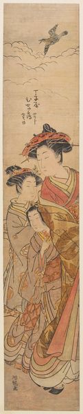 Curator: Up next, we have a paper print titled "Mosquito Net (Kaya), from the series Model Young Women Woven in Mist (Kasumi-ori musume hinagata)," by Kitagawa Utamaro. Editor: The first thing that strikes me is the intimate quietness. The somber palette casts such a meditative light. Curator: Utamaro, working in the Late Edo period, captured the essence of feminine beauty, focusing here on line and composition. The mosquito net itself becomes a compositional element. Editor: It's like a veil, a screen—both obscuring and revealing. I wonder what conversations they are having in that space. Curator: Indeed, the gaze is intense, and their gestures appear frozen, timeless. Editor: Yes, there is something enduring in their pose. I imagine I will carry this feeling of wistful reflection with me today.