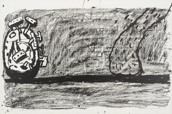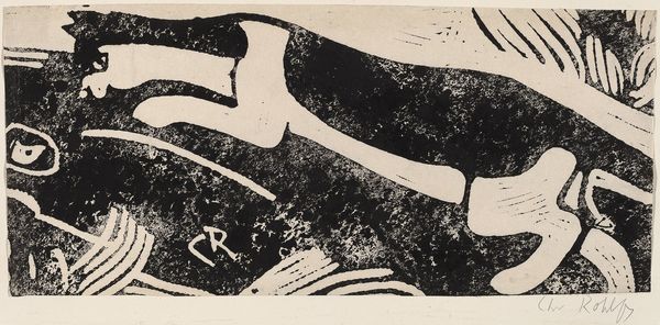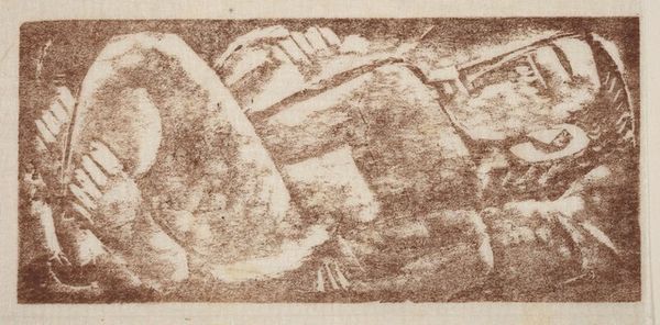Editor: Christian Rohlfs' "Cat and Mouse," a print, feels primal, a visual echo of a timeless struggle. What symbols jump out at you? Curator: The simplified forms themselves carry a weight. The cat, a fluid line, speaks to predatory instinct. The mouse, fragmented, represents vulnerability, a universal symbol of the underdog. Editor: So, it's less about the literal animals and more about what they represent? Curator: Precisely. Consider the negative space, the "ground" of the image. Does it feel like a safe haven, or another layer of threat? Rohlfs uses these age-old figures to expose vulnerability and terror. Editor: That's fascinating; I hadn't considered the role of the negative space. Curator: Visual symbols are never isolated; they exist within a network of meaning. It is very telling that Rohlfs made the background a texture of threat. Editor: I see. I'll definitely look at symbols differently from now on.