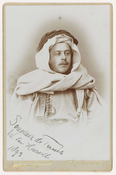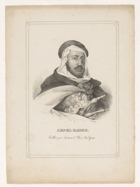 Editor: So this is a portrait of Abd el-Kader, Bey of Mascara, created sometime between 1830 and 1899 by H. Straub. It’s an engraving, and it strikes me as quite formal and imposing. What can you tell me about its symbolic elements? Curator: This engraving certainly resonates with potent symbolism. Abd el-Kader is presented not merely as a man but as a symbol of resistance and spiritual authority. Consider the details: the meticulous rendering of his garments, hinting at status and piety, as well as the sword held up with the other ornaments. What impression do these elements leave on you? Editor: I guess the sword, in particular, combined with his steady gaze, implies power, maybe even a warning. It definitely suggests that he’s someone to be reckoned with. Curator: Precisely. His gaze, as you observe, is central. Beyond immediate impressions, I’d argue his image draws heavily upon pre-existing cultural memories related to leadership, spirituality, and resistance within an orientalist framework. Consider the layering of meaning: is the representation about the person, or is it a larger statement about cultural conflict and identity during that era? How do you read the role of orientalism impacting its original creation? Editor: I see what you mean. The "orientalism" tag made me consider that too. The image could serve multiple purposes simultaneously, and carry emotional and ideological weight, depending on the viewer’s cultural perspective and biases. Curator: Exactly. This engraving uses potent symbolism. The image invites consideration of how visual language shapes our understanding of historical figures, especially those from different cultural backgrounds. Editor: I hadn't considered how my own perspective filters my interpretation of it! That's fascinating. Curator: Indeed! Exploring such pieces reminds us that imagery carries immense responsibility.