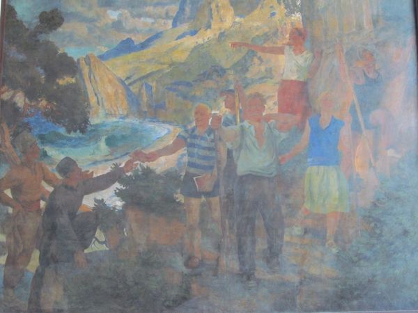 In 1968, Minas Avetisyan created this painting, *Scene in village Jajur*, using oil on canvas. Avetisyan’s choice of oil paint allows him to build up layers of color and texture, creating a tangible sense of the village environment. You can almost feel the rough texture of the stone walls and the sun-baked earth. The visible brushstrokes and the slightly muted palette also suggest a direct, unvarnished view of rural life. The artist's skill in manipulating the medium to depict the everyday realities of village life elevates the ordinary to the level of fine art. It is a reminder that the beauty and significance can be found in the materials, the making, and the social context of the artwork itself.