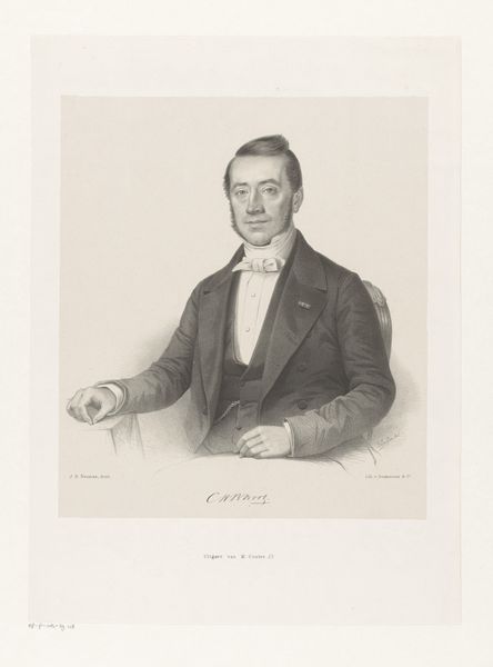 Curator: Here we have a pencil drawing entitled "Portret van Johannes Marius van Stipriaan Luiscius." It's housed right here at the Rijksmuseum and was created sometime between 1822 and 1845 by Franciscus Bernardus Waanders. What’s your initial take? Editor: It has the feel of a sepia-toned photograph, even though it’s rendered by hand. A touch melancholic, wouldn’t you agree? He looks like a man caught in the amber of his own seriousness. Curator: It’s fascinating you mention the photograph because drawings like these, with their exacting detail, were often precursors to photography becoming widely available. It served a vital need for portraits, to capture likeness and…social standing, I suppose. The starkness highlights that. Editor: The symbols here are subtle, yet potent. The man's tailored suit suggests professional success. The high collar alludes to someone important, but look at the gentle curves rendered with pencil! How deliberate, to soften a possibly rigid individual. A very canny study. Curator: I find myself thinking about what a different world he occupied. The lack of background clutter forces us to concentrate on his person. It’s a romantic realism. An accurate depiction but perhaps softened to convey the dignity expected of portraiture at that time. Editor: Precisely! Academic art, yes, but also tinged with the romantic ideals of the era. Waanders seemed to understand the psychology of image-making implicitly. The act of drawing imprints intimacy on what could have been merely documentary. The artist creates meaning while also translating life. Curator: A meaning certainly open to interpretation. Perhaps what's most beautiful is its fragility—that light pencil work. What has endured over nearly two centuries captures a moment and hints at timeless universals of human dignity. Editor: Indeed. I’m now thinking not about status, but something universal—a person gazing from their time to ours. A pencil drawing that can transport, so wonderful!