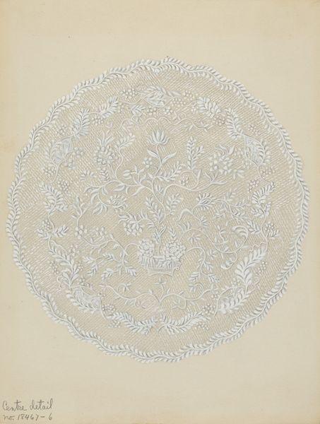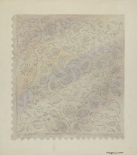 Curator: Looking at this work, titled "Quilted Bedspread" by Irene Schaefer, created around 1936, what strikes you first? It appears to be a mixed-media piece involving drawing and textile elements. Editor: It gives off an immediate sense of fragility, almost like a whisper. The muted color palette, predominantly whites and creams, enhances that feeling. I wonder about the labor and care that went into such a delicate design. Curator: Absolutely. These floral motifs and the geometric structures represent more than just decorative elements; they symbolize the tradition of quilting and the role of women’s work within the domestic sphere. It represents themes of care, intimacy, and quiet artistry. Editor: Yes, there is a strong association of textiles with the domestic and feminine. We must ask how the very act of quilting can be seen as an assertion of identity and agency. Textile work has historically been relegated to the margins, but this piece pulls it into the foreground, demanding recognition of its artistic merit and historical relevance. Curator: And if you consider bedspreads themselves as cultural objects, we realize how intensely personal and laden with symbolic potential these textiles can be. Dreams, memories, familial lineages, handed down and kept for future use—it all weaves together in a work like this. Editor: Given the date of this quilt pattern design, 1936, I wonder if the economic realities of the Depression era shaped it somehow. Did scarcity inform the choices made? And if so, what larger narratives of resilience and resourcefulness are embedded within it? It also appears that it is one quarter of the original quilt pattern, thus one can assume this image functioned as the directions for creating the whole. Curator: Good points to consider when examining such domestic patterns. Beyond material constraints and function, the symbolic language really grabs me, thinking of Jungian symbolism. The geometric order mixed with blooming floral shapes speaks to integration—a subconscious desire to resolve internal conflicts in everyday life. Editor: I completely agree. Looking at this piece helps me understand how art is so intertwined with the broader social and historical contexts. This is more than just pretty decoration. It serves as material culture that embodies collective memory. Curator: Absolutely. Exploring its cultural roots helps us see how this image serves not merely as a design, but rather an anchor. A delicate link to a vibrant past and a quiet yet palpable assertion of self. Editor: And for me, engaging with this piece sparks new questions around identity, memory, and materiality—all vital components for a contemporary perspective on historical artwork.