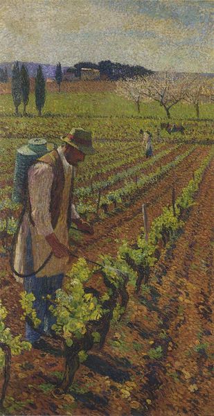 Here we have Henri Martin’s painting, Farmer. The composition emphasizes a structured landscape, where rows of vines lead the eye towards a distant horizon, creating a sense of depth and order. The subdued color palette, dominated by earthy tones and muted greens, may evoke feelings of calm and connection to the land. Martin uses pointillist techniques, applying small, distinct dots of color that blend optically. This approach allows for a nuanced depiction of light and texture, adding an ethereal quality to the scene. The formal structure also reflects the artist's exploration of the relationship between labor, landscape, and the human figure, with the farmer's toil adding a layer of meaning to the broader visual experience. In its totality, the painting uses pointillism to blend aesthetic beauty with the realities of rural life. The painting offers a complex meditation on labor and landscape, highlighting the subtle interplay between artistic form and cultural meaning.