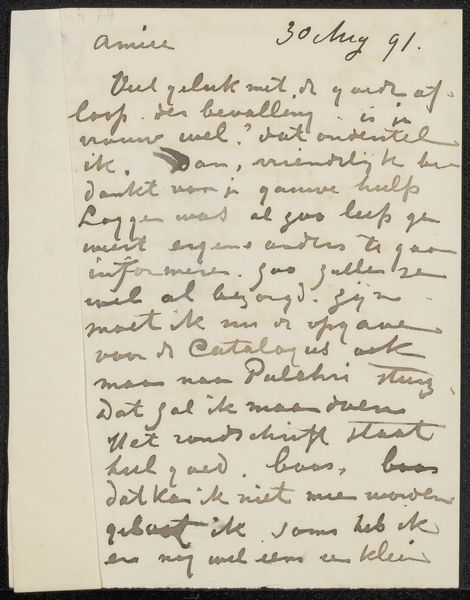 Curator: Welcome. Today we're observing "Tekst af Karl Madsen. Løsblad," a page of manuscript text attributed to Johan Thomas Lundbye, created sometime between 1895 and 1938. It resides here at the SMK - Statens Museum for Kunst. What are your initial thoughts? Editor: The script feels so immediate, like capturing a private thought as it blooms. The density of the ink and the intimacy of the handwriting lend an almost overwhelming sense of introspection. Curator: Intriguing. From a formal perspective, notice the composition, with its relatively even distribution of textual elements across the aged paper surface. The artist’s chosen medium, ink on paper, dictates a kind of starkness, allowing the content itself to take precedence. Editor: Yes, absolutely. And the Swedish text gives me pause - a mix of romantic and longing, possibly about romantic ideals. It reads to me as something profoundly personal and possibly even painful in its reflections. Curator: Consider, though, that text is just as crafted as any brushstroke. Lundbye’s choice of words, their arrangement... These textual components possess shape and weight, even texture of sorts, functioning as graphic elements as well as carriers of denotation. Editor: Precisely! The act of writing, especially with ink, brings an intensity to expression. It's a committed act, symbolizing that Lundbye wants to leave an impression, a testament. Even in privacy, there's a desire to connect through these written forms, a reaching across time. The handwritten text shows the symbols we’re interpreting, creating an emotional narrative. Curator: Do you find the age of the work influencing how you connect with the writing? Editor: Incredibly. I sense layers upon layers of time weighing on those inked words— both then, as Lundbye made these choices, and today, as we see this document that has made it through decades, carrying meaning for generations beyond its creator. The simple symbols on a page become infused with generational weight and intent. Curator: I appreciate you connecting us with that layering, because it demonstrates what's fascinating about encountering historical texts like this one. Editor: And I'm struck by the power of this simple yet emotionally charged page. The written symbol creates powerful intent between both of us.