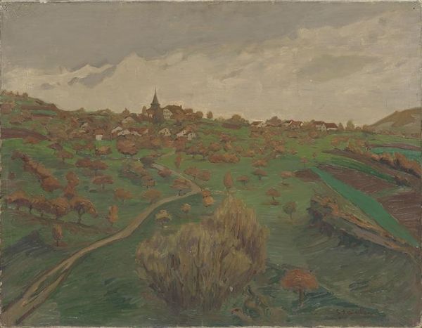 Editor: Here we have Ker Xavier Roussel’s “Landskab ved Cuiseaux” from 1906, held at the SMK. It’s an intriguing landscape in pastel that evokes a sense of both tranquility and slight unease. What strikes you most about it? Curator: I see a subtle commentary on the industrial encroachment upon the natural world, and perhaps even class conflict, expressed through the lens of intimate Romanticism. Roussel, though associated with the intimist movement, operated within a rapidly changing social and political landscape. The seemingly serene depiction of Cuiseaux hints at tensions simmering beneath the surface of rural life. Editor: Tensions? Where do you see those tensions arising? Curator: Consider the viewpoint. We are positioned as outsiders, looking down on the town. The foreground is almost aggressively textured, obscuring our view, denying easy access to the idyllic scene beyond. The way he applies frottage can even be seen as creating a texture which hints at something darker or rougher. Could that roughness stand for the exploitation of the rural workforce, rendered invisible, even abstract, beneath a veneer of bourgeois comfort? Also, notice the looming structures—factory chimneys?—that pierce the horizon. How do those relate to rural life in Cuiseaux? Editor: I didn’t think about it that way. It's true that I was caught up in the pleasing aesthetic. The artist captured that light in an almost Impressionistic style. Curator: And, let’s not ignore the social dynamics that Impressionism represents: A largely white, male gaze that often sidelined working-class voices. Here, the techniques are employed to maybe make the viewer consider that those who are often forgotten are being seen here as relevant to a world quickly shifting between Romantic ideas of beauty and a more urgent Modernity. Editor: I see. It makes you think about the unseen realities behind even the most picturesque scenes. Curator: Precisely! It asks us to consider not just what we see, but whose perspective is prioritized, and what stories remain untold.