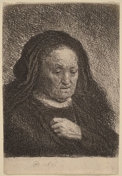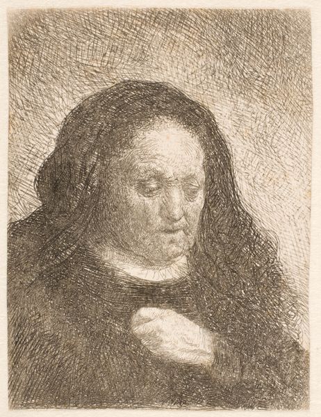 Editor: This etching, "The Artist's Mother with Her Hand on Her Chest," created by Rembrandt van Rijn in 1631, feels so intimate and melancholic. The detail is incredible for such a small print! How do you interpret this work, especially considering it's his mother? Curator: It's interesting, isn’t it? A poignant glimpse into a relationship, perhaps even a meditation on mortality, captured through Rembrandt's incredibly sensitive lines. The way he uses light and shadow, it’s not just observation; it's almost like he’s drawing her soul. And that hand… is it a gesture of protection? Of pain? It draws me right in. Tell me, what does it evoke for you? Editor: I see both protection and a bit of weariness. Her gaze is downwards, and the hand almost shields her heart. The lines around her eyes seem so heavy, capturing a lifetime. Curator: Absolutely. Now, Rembrandt often used family members as models. Perhaps this etching was, in part, an exercise in capturing emotion, of mastering his technique. But to me, it transcends that. Look at the background. It’s not defined, but energetic— almost chaotic, heightening her stillness and reinforcing her quiet strength. It's almost like a stage, focusing us entirely on her being. Editor: It's like she is holding her entire world to her chest! I can definitely appreciate that tension now between her stillness and the restless background. Thanks for showing me that. Curator: My pleasure! Each viewing reveals something new. I always feel as though Rembrandt's not just portraying her, but conversing with her through his art, and us too of course. It’s like time travel through emotion, isn’t it?