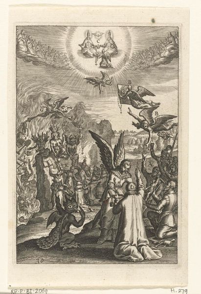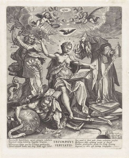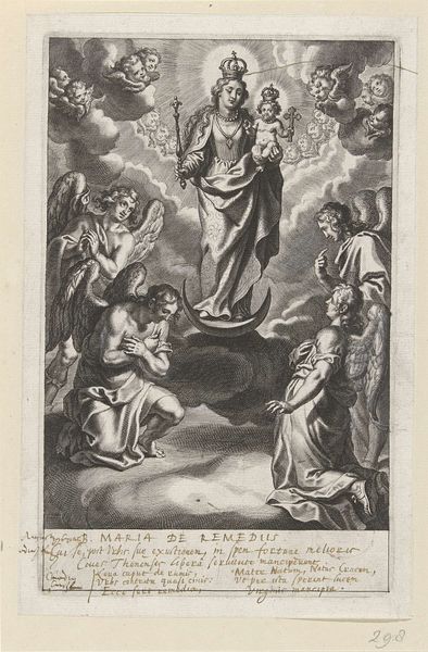 Curator: Here at the Rijksmuseum, we're looking at "Maria met Kind staande op een globe," an engraving by Cornelis Galle I, created sometime between 1586 and 1650. Editor: My goodness, what a swirl of activity! The composition just bursts with cherubs, clouds, and a very imposing Madonna. All in stark monochrome. It’s both divine and incredibly busy. Curator: The medium, engraving, is key here. It allowed for relatively mass production and distribution of this imagery. Galle's skill highlights how printmaking was essential in disseminating religious and political ideals during the Counter-Reformation. Editor: It certainly does feel like propaganda, albeit heavenly propaganda. I keep coming back to the detail. Look at the texture achieved just through lines! It's almost overwhelming; the tiny cherubic faces seem to be competing for attention. Curator: The "globe" itself warrants consideration. Mary and Child standing upon it—and crushing the serpent, of course—symbolize the triumph of Catholicism globally. The production of the print itself becomes a statement of that triumph. Editor: Triumph, yes, but also confinement. There’s something unsettling about placing divinity atop the world in this way. I mean, talk about pressure! Though visually impressive, it raises questions about the earthly burdens associated with such ideals. Does absolute power corrupt even divine intentions? Curator: Your point about the burdens is fascinating. It redirects us from a purely celebratory reading to one contemplating the earthly implications and the role of production, how prints like these influenced not only religious belief but also societal power structures. Editor: Absolutely. Art always acts within its historical setting. Galle’s work has prompted me to think about art’s influence on ideologies, even though its impact, at first, may have simply looked "heavenly". It can become so much more when viewed through the lens of power, and materials. Curator: Agreed. It's those intricate, tangible connections, the layers within even seemingly straightforward imagery that makes the era and these works so perpetually compelling.