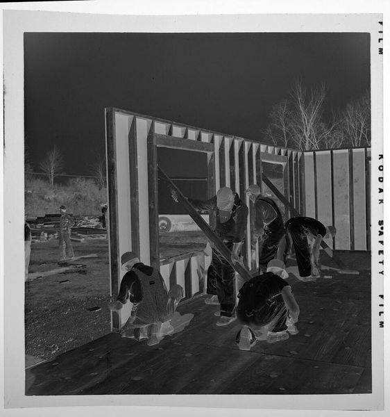Curator: Here we have Jack Gould’s silver gelatin print, *Untitled (paramedics loading stretcher into ambulance)*, housed here at the Harvard Art Museums. Editor: It’s stark, isn't it? The high contrast makes the scene feel both urgent and detached. Like a memory surfacing in fragments. Curator: Indeed. Gould captures a very specific moment: paramedics carefully transferring someone onto a stretcher and into an ambulance. Given the nature of the subject matter, how do you interpret this choice of imagery? Editor: Well, ambulances often serve as potent symbols of crisis, vulnerability, and the boundary between life and death in our collective consciousness. To see this rendered in such a blunt, almost confrontational style adds to that tension. Curator: I agree. And considering the prevalence of such scenes, particularly within the context of public health and safety, it raises questions about our access to care and how these services are represented in visual culture. Editor: It prompts reflection, doesn't it? On what we choose to remember, and how these symbols persist in our shared visual language.