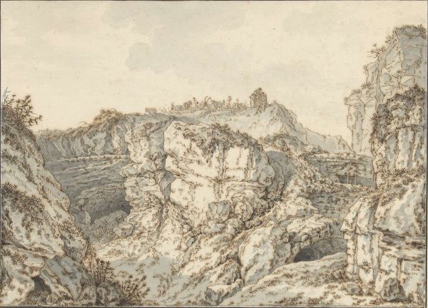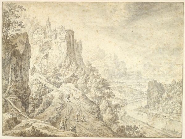 Curator: Ah, a Dutch master rendering a scene of slow decay! I'm drawn to this artwork, Pieter de Molijn's "Landscape with Ruined Castle and Three Figures," dating back to 1664. Editor: Ruin, indeed. It feels… wistful, almost haunted. All those wispy pencil strokes against the aged paper-- it’s as if the memory of this castle is fading right before our eyes. Did he actually witness these ruins, or is this a melancholic fantasy? Curator: De Molijn was known for his keen observation of the Dutch landscape. This seems to me a sensitive meditation on the passage of time, a favorite subject of the Baroque era. Editor: Well, look at the placement of the castle. A ruined castle usually tells of human error: war, plague, neglect… It feels like a visual metaphor for something lost, not just stone and mortar, but maybe even innocence or former glory. Note how the path seems to lead away, out of this time long past, further into nature. Curator: It also echoes, quite possibly unintentionally, the theme of Vanitas so beloved by painters of his day. Look how the figures are dwarfed by the ruin. A stark commentary of the insignificance of mortal life against nature and time. The ruin symbolizes earthly glory reduced to rubble. Editor: Vanitas is there in every fallen brick. What’s powerful here is that De Molijn hasn't shied away from this desolation. There is an almost loving detail in the castle's decay – even the sky is empty but present, as a metaphor for melancholy in decline. It shows us everything comes full circle in a way. What once was built, is brought back to nothingness through the forces of nature. Curator: Absolutely. He captures the cycle, making it both tragic and beautiful, wouldn't you agree? Editor: Beautiful indeed. Now that you’ve framed this picture through art historical references, I sense something about rebirth within decay as well. Perhaps not merely mourning but transformation. Curator: It's fascinating how a single image can evoke such layers of thought and emotion. Thank you! Editor: Thank you, this decaying castle suddenly feels much more alive!