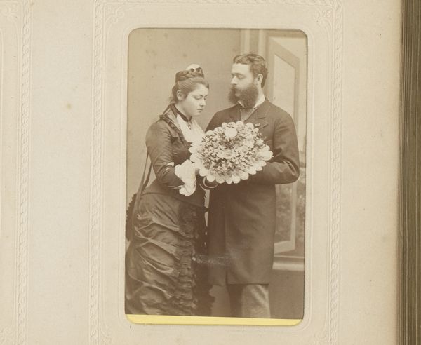 Editor: Here we have an intriguing promotional print by W. Duke, Sons & Co., from around 1890-1895, titled '[Actor and actress embracing]'. It's from the Actors and Actresses series and was actually issued to promote Duke Cigarettes. I’m struck by the staged nature of the embrace and the materials involved in producing it – paper, ink, and photography combined. What do you make of it? Curator: Precisely! Let’s look closer at the act of production here. This isn't just art, it's advertisement. Consider the labor involved: from cultivating tobacco, manufacturing cigarettes, photographing the actors, printing the image, to its distribution. It creates a fascinating intersection of the culture industry, theatrical performance, and commodity capitalism. What is being consumed here: the image, the cigarette, or the celebrity image? Editor: That makes so much sense! It's easy to see the photograph as just an image of performers, but the photograph *itself* is also a commodity. The labor of making and distributing the photograph parallels the product it promotes. Curator: Exactly. And note how the photographic process itself flattens and standardizes. It turns individual performances into repeatable images for mass consumption, impacting how labor and artistic talent are commodified. How do you think the accessibility of photography impacts traditional art forms like portraiture and painting at this time? Editor: Wow, I hadn’t thought of that. The photograph is a way to bypass traditional methods of artmaking while being produced at a larger scale...making art accessible to all through commerce. Curator: Absolutely. So, instead of asking whether it's *good* art, we need to ask *what* it does, *who* it serves, and *how* it reveals the social relations embedded in its creation and distribution. It shows how “high art” like portraiture is re-evaluated within popular visual media and industrial capitalism. Editor: It's been so helpful to shift the focus from just the subject matter of the image to the materiality and broader systems that created it. Thanks!