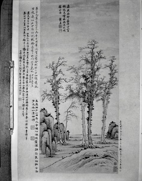 Editor: Hokusai's "Night Rain in the Yoshiwara," from the series "Eight Fashionable Views of Edo," is a striking woodblock print. The monochromatic palette creates a somber, almost secretive mood. What compositional elements stand out to you? Curator: Notice the organization of space, Editor. Hokusai employs a distinct layering: the distant rooftops, the bustling street, and the foreground water. The rhythmic repetition of forms—roofs, umbrellas—creates a visual cadence. What might that signify? Editor: Perhaps the relentless, everyday nature of life in Yoshiwara, even in inclement weather? Curator: Precisely. The artist's formal arrangement underscores the enduring character of this place. The linear perspective, while present, is flattened, prioritizing surface design over spatial illusion. It draws our attention to the print's inherent two-dimensionality. Editor: I see it now! The composition reinforces the subject. Thanks for pointing out those aspects.