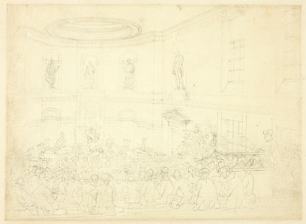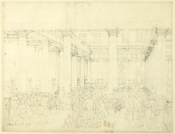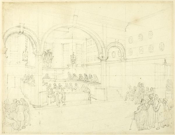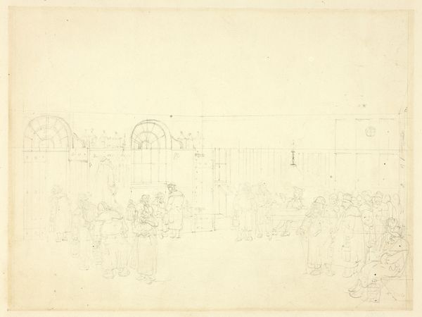 Jan Brandes created this pencil drawing, titled "Het VOC-gezantschap te Kandy," in the late 18th or early 19th century. The drawing's fine lines and understated texture speak volumes about the artist's skill and the deliberate choices made during its creation. Each stroke of the pencil reveals a careful consideration of form and perspective. The drawing looks like it might have been a preliminary study for a larger project. The architecture and figures are captured with simple and light marks. This technique enables the artist to explore spatial relationships and composition before committing to a more elaborate rendering. The social context of the Dutch East India Company, or VOC, cannot be ignored. Brandes' drawing serves as a window into the political and economic ambitions of the Dutch Empire and its interactions with other cultures. The drawing's significance lies not only in its aesthetic qualities but also in its ability to engage with historical narratives of power, trade, and cultural exchange. By recognizing the drawing's material and historical dimensions, we can appreciate its value as a cultural artifact and its capacity to enrich our understanding of the past.