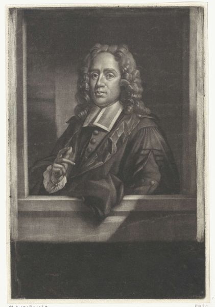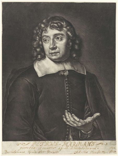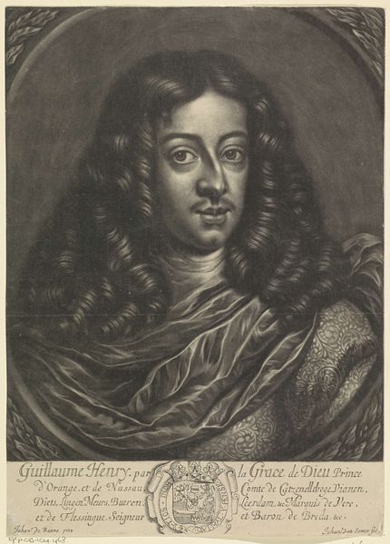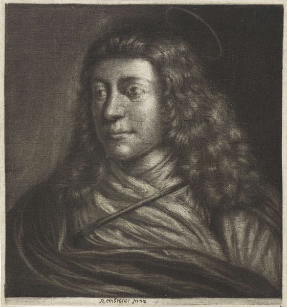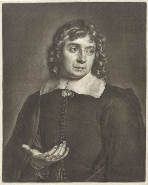 Wallerant Vaillant created this mezzotint portrait of a young man, possibly Steven Sleger, in 1651. Vaillant was part of a wave of 17th-century Dutch artists who navigated the complexities of portraiture in a rapidly changing society. Here, the sitter's gaze is direct, yet there's a vulnerability in his expression. The soft rendering achieved through the mezzotint technique adds to this sense of intimacy, inviting us into a personal space. The flowing hair and draped fabric challenge the rigid gender norms of the time, suggesting a more fluid presentation of self. It is worth considering how much control Steven Sleger had over his own image. This portrait captures a specific moment, shaped by the artist's interpretation and the sitter's willingness to participate in this constructed representation. It's a collaboration, a dance between identity and artistry.