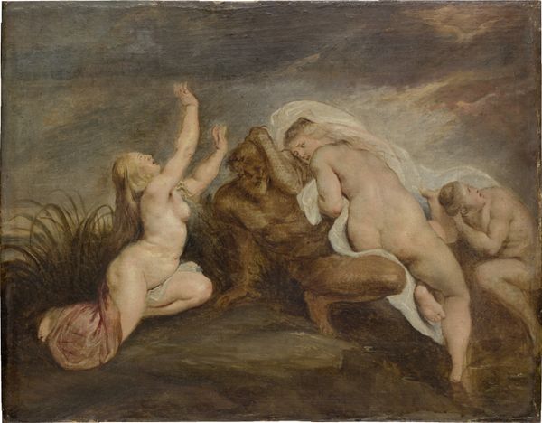 Curator: Henri Fantin-Latour's 1886 oil painting, "Tannhäuser," offers a glimpse into a scene inspired by Wagner's opera of the same name. Editor: Oh, the swirling figures give me a fever dream vibe—like a hazy recollection of a wild garden party. Is that supposed to be Venus and her nymphs? Curator: Exactly! Fantin-Latour was deeply inspired by Wagner's operas. Here, he visualizes the mythical Venusberg, a realm of sensual pleasure where Tannhäuser, the knight and poet, finds himself seduced. The nymphs embody that world’s intoxicating allure. Editor: You can almost feel the weight of the impasto on the canvas—look at how thickly the oil paint is applied to create the forest and swirling garments. It reminds me a little bit of cake frosting, if I'm honest. Do we know if Fantin-Latour experimented with particular varnishes? The tones are very warm for such a potentially sinful scene. Curator: I agree—it has a decadent, rich quality. Fantin-Latour had a particular sensitivity to the atmospheric effects of colour, often layering glazes. Considering the period and Wagner’s influence, it could be argued the intent was not sinful. Wagner explored themes of redemption through love, which Fantin-Latour possibly tapped into here. The almost ethereal quality certainly softens any harsh judgements. Editor: Good point! Seeing the art of painting and operatic visions entangled, it's striking how much they both rely on, and construct, illusions through craft. Whether through pigment and canvas, or libretto and performance, they provide immersive aesthetic experience. And it does appear here that there is some form of labor by all who feature in the picture...a hedonistic sort of labor perhaps. Curator: Very much so. A sensory exploration for both the creator and viewer. It truly illustrates the artist's fascination with translating music into a visual form, inviting us to lose ourselves in Wagnerian mythos. Editor: Well, now I am dying to know what instruments that musician nymph has been crafting for the day's orchestral agenda. Let's look further at Fantin-Latour’s materials on our next viewing.