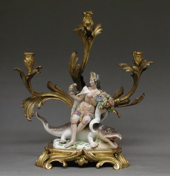 Curator: This is “The Chinese Emperor,” a porcelain sculpture crafted by the Höchst Manufactory between 1761 and 1771. Editor: My first impression is a kind of delicate theatricality. The Rococo style gives it this sense of lightness and movement, but it's all rendered in such precise detail. It feels simultaneously grand and incredibly fragile. Curator: Exactly. The sculpture provides a window into the 18th century European fascination with the East. We have to understand that pieces like these are more reflections of European fantasies than accurate portrayals of Chinese culture. There is no historical emperor that dressed or acted that way, and so it reflects colonialism. Editor: The symbols tell such a clear story of the time! Consider the miniature dog at the Emperor's feet: dogs often represented fidelity. Then we see other symbolic roles presented. Curator: Absolutely. The inclusion of specific imagery contributes to the overall message—in this case, power dynamics and racial biases. In this image, notice who’s kneeling before whom, for instance, and how status is explicitly portrayed. Editor: The tented canopy also carries certain weight. Not merely shelter but an assertion of hierarchy, framing the Emperor at center. Do you think it evokes an association with religious iconography too? It brings to mind Renaissance altarpieces with Mary in central view. Curator: Interesting parallel, though the "altarpiece" here is built upon very skewed cultural power dynamics. We can appreciate the artistic skill and elaborate aesthetic without letting go of the historical context surrounding the cultural appropriation it reflects. Editor: A compelling case, reframing how we can appreciate artwork through symbolic elements, understanding them as echoes from collective memory while viewing art critically and contextually. Curator: By layering this appreciation within the intricate framework of power structures from history, we give new insight on the work.