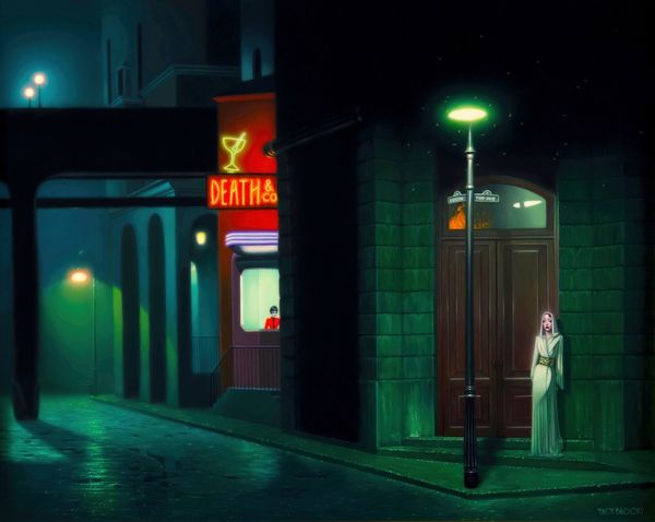 Curator: Looking at Nigel Van Wieck's oil painting, "Come Tomorrow," the first thing that hits me is the loneliness. That blue, that heavy, almost oppressive blue of the night… it just permeates everything. What jumps out at you? Editor: Initially, it’s the interplay between the cool blues and the warm yellows—the contrast creates a visually arresting composition. Van Wieck masterfully uses light and shadow to define the geometric forms of the motel architecture, emphasizing the structure's horizontal linearity. Curator: Right, the composition is striking. But it’s also a bit unsettling, isn’t it? The figure standing there, on the cusp of something, bathed in that stark doorway light… it's like she's stepped out of a dream, or maybe a forgotten movie scene. Editor: Precisely. The figure's placement adheres to classical principles of proportion, subtly reinforcing a sense of balance and harmony. Consider, too, how the "MOTEL" sign looms overhead, its stark neon asserting a commercial yet detached presence in this tableau of anticipation. Curator: Commercial and detached…yes! It adds this layer of vintage Americana tinged with… well, desperation. It's that classic trope of the transient, the lonely traveler, the…promise of tomorrow that may never come. And those three stars in the sky…pinpricks of hope in a vast, indifferent universe. Editor: Symbolically, the open doorway serves as a threshold—a transition between states of being, between the public exterior and the private interior. Van Wieck utilizes semiotic cues to suggest themes of longing, anonymity, and the temporal nature of existence, filtered through the lens of late 20th-century modernism. Curator: I always find myself wondering about her story. Who is she waiting for? What decisions has she made that led her to this exact point in time, beneath that flickering motel sign? Maybe, though, the point *is* that we don't know. Editor: Indeed. By deliberately withholding narrative specifics, Van Wieck encourages us, as viewers, to engage in our own processes of meaning-making—constructing personal narratives that resonate with the artwork's inherent ambiguities and suggestive forms. The true strength lies not in answers, but in possibilities. Curator: Yes, leaving us with possibilities. Ultimately, it feels as though Van Wieck has painted not just a picture, but an emotional question mark. Editor: Elegantly phrased. A question mark rendered in oil, light, and shadow.