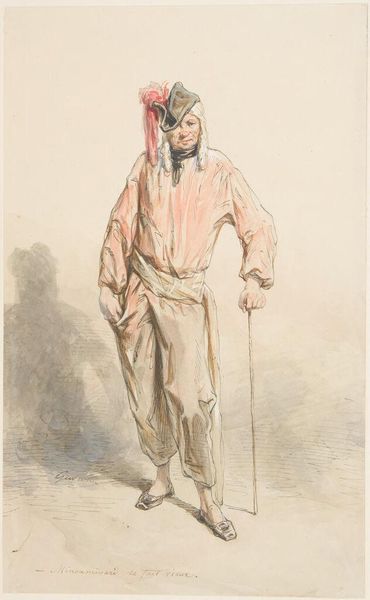 Curator: Here we have "A Sailor Standing on the Shore," a watercolor by Paul Gavarni, dating back to 1860. It's currently residing at The Metropolitan Museum of Art. What are your immediate thoughts on encountering this piece? Editor: A solitary soul, wouldn't you say? The palette feels…resigned. Earthy tones dominating, even the sailor's red sweater seems muted, like a whispered shout against the vast backdrop. He stands on the cusp, but to where, I wonder? The future, or just the relentless sea. Curator: Gavarni’s process involved capturing fleeting moments en plein air, which speaks to the burgeoning Realism movement. It emphasizes accessible themes through observation and documentation. The materials themselves, watercolor and paper, lend a sense of immediacy, capturing a specific moment of light and atmosphere in contrast to grand historical painting. Editor: The 'moment' is everything here. It's beautifully observed, all those watercolour washes capturing a weight on his shoulders, as if the very air is dampening his spirit. The visible brushstrokes make me consider its making. This is so raw; the human touch really resonates, unlike an oiled-up Academician gazing off at the horizon, chest puffed out! This feels like work, both for him and the artist. Curator: Absolutely. We see Gavarni engaging with contemporary issues and social types rather than idealized subjects. The "sailor" represents a specific class and occupation, grounding it in social reality and material conditions of labor. One wonders, what port of call is next, or whether the water reflects his own life course. Editor: Maybe it’s the very notion of being land-locked...The fellow's face is shadowed and it only adds to the mood. We're left contemplating not just the person, but the endless horizon of choices a sailor makes when they face forward like that. It isn't so obvious here... it hints a bigger story is taking place outside the page. Curator: I think your read touches on Gavarni's interest in encapsulating and understanding a critical part of life on the sea in 19th century. By emphasizing observation through process and by embracing ordinary workers and labor, this speaks more deeply of that reality. Editor: It’s more complex than it appears on the surface, wouldn't you agree? Thank you for shedding light on Gavarni's unique process, context, and choices; these all helped reveal it.