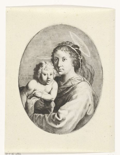 Curator: This engraving is entitled *Maria met het Christuskind*, or Mary with the Christ Child. It’s the work of Johann Friedrich Leonard and dates to 1669. Editor: It has a strangely ethereal quality, almost dreamlike, rendered in what looks like shades of pale charcoal and ash. The oval frame intensifies the feeling of looking into a softly lit interior. Curator: Yes, Leonard employs the oval to create a kind of sacred, enclosed space. The halos emanating from the Virgin Mary and Christ Child resonate deeply with centuries of Christian iconography. Consider the symbolism of the maternal embrace. Editor: Indeed, the maternal motif is powerful here, but observe the technical skill: The lines, thin and precise, build form through tonal variation alone. The interplay of light and shadow defines every fold of fabric, every curve of flesh. Semiotically, the halos signify divinity, but the engraving technique is masterful. Curator: Precisely, it builds on an archetypal understanding of the divine feminine. The image harkens back to a vast cultural memory of the Madonna and Child as symbols of purity, motherhood, and divine grace, rendered in the style of the Baroque. Editor: The artist's handling of the engraved line is key. The image has this strange oscillation of clarity and abstraction due to this medium and use of only gray tone. I find it alluring. Curator: For me, the symbolism of light overcomes that quality; light emerging from both figures suggests enlightenment—literally illuminating faith in times of obscurity. It’s like an intimate portrayal that reflects universal hopes and anxieties. Editor: Well, I am struck how such a range of tonal texture can be achieved with this relatively ‘simple’ technique. The engraver utilizes a sophisticated economy of means to establish light, shadow, form, and texture. Curator: I think we both agree there’s more here than immediately meets the eye, or the ear, in our case. Editor: Absolutely; it invites us to explore art's ability to evoke complex emotional states through both symbolic representation and pure form.