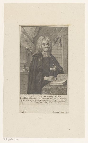 Curator: Just look at him, so composed. This engraving, dating from around 1724 to 1733, presents a certain Johann Gottfried Kirsch, according to the Rijksmuseum's records. It's by Martin Bernigeroth. Editor: There's something immediately imposing about this portrait, isn’t there? A kind of quiet confidence radiates, even though the tonality is subdued, almost melancholic. And what's with that oversized wig? Curator: Oh, the wig is pure Baroque swagger. Think of it as a visual marker of status. Bernigeroth, I suspect, was going for a sense of gravitas. And Kirsch clearly obliged by gazing intently at the viewer. Editor: Gravitas is definitely the word. I wonder though, what this image tells us about class and the performative aspects of identity in that era? Is Kirsch's attire simply a matter of conforming to social norms, or something more pointed? I'm reminded of Foucault’s ideas around self-discipline and power structures and what counts as an approved type of display and presence. Curator: A performance, you say. Interesting angle. Perhaps the column in the background and even the curtain is playing into this construction of power? Reminding one that Kirsch should be placed on a pedestal for the ages to remember. Editor: Absolutely, everything is meticulously curated here, nothing is out of place, but there are other questions I can’t overlook either: Who was Bernigeroth trying to reach through his work? Was the target group limited to a certain societal status? Was Bernigeroth successful in highlighting social status as an element in Kirsch's portrait, or do elements like class differences prevail in its deeper reading? Curator: A worthy set of questions about cultural messages to carry onward with you today. In conclusion, I find that in "Portret van Johann Gottfried Kirsch," it’s fascinating to see how artists grappled with capturing not just a likeness, but a persona, through meticulous details and careful staging. Editor: And I, how representations like this reinforce societal expectations, revealing that even the most meticulous portraits exist within, and contribute to, a web of power dynamics.