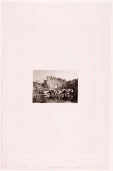 Editor: This is "The Abbey Pool" by John Cousen, and it seems to depict a pastoral scene with cattle drinking. What's significant about the representation of ruins and livestock here? Curator: Well, the romanticized depiction of ruins was very popular, wasn't it? But the addition of livestock suggests an agrarian ideal, perhaps even a commentary on land use and the changing social landscape. How might its display in a public museum reinforce that reading? Editor: I see what you mean. Presenting this scene elevates it beyond a simple landscape. It suggests something about the past and perhaps even England's identity. Curator: Exactly. And consider who would have viewed and owned such prints, shaping their understanding of landscape and belonging. Food for thought! Editor: Indeed. It really changes how I see the piece now, thinking about its social context.
