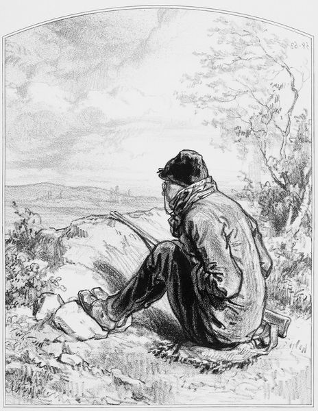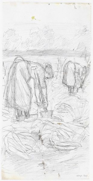 Curator: There's such a striking bleakness to this work, isn’t there? The charcoal gives it this immediate sense of solemnity, like looking at a fading memory. Editor: Indeed. What we're looking at is Winslow Homer's drawing "Fisherwomen," created around 1882. This charcoal and pencil piece offers a glimpse into the lives of working women, a common theme in Homer's art. Curator: The weight these women carry—both physically and metaphorically—is palpable. The heavy baskets, the weathered clothing, it all speaks volumes about their arduous lives, and the economic hardships placed on women of the era. Editor: Absolutely. Homer often depicted rural life and the relationship between people and nature. This piece certainly embodies that, focusing on the labour of women in coastal communities. Notice how they dominate the composition, figures walking out of shadow as opposed to lying flat under it in that beached vessel. It disrupts assumptions of gender, challenging notions of weakness or delicacy associated with femininity. Curator: I appreciate how he avoids idealization. It's not a romantic vision of womanhood, but a raw portrayal of their everyday struggles. I think viewers would've definitely considered Homer’s politics regarding representation. And how that, for many female observers especially, spoke of their value beyond aesthetic purposes. Editor: Homer was indeed challenging prevailing artistic conventions. He moved from his earlier idyllic genre scenes and illustrations toward a form of realism that reflected the growing social consciousness. Consider also the impact of Impressionism on Homer, this sketch is reminiscent of the kind of social landscape favored by the likes of Edgar Degas. He had adopted it, reappropriated, or been influenced in similar artistic directions. Curator: Looking at it now, there’s a modern aspect, one beyond Homer's place in a linear telling of the history of American Art, and it also has the ability to act as a mirror through which modern day audiences are asked to reflect and think more carefully about societal power dynamics. Editor: I concur. "Fisherwomen" serves as a potent reminder of the burdens disproportionately placed on marginalized people. Homer challenges the status quo by placing them at the heart of the image, thereby prompting reflection on our contemporary societal framework.