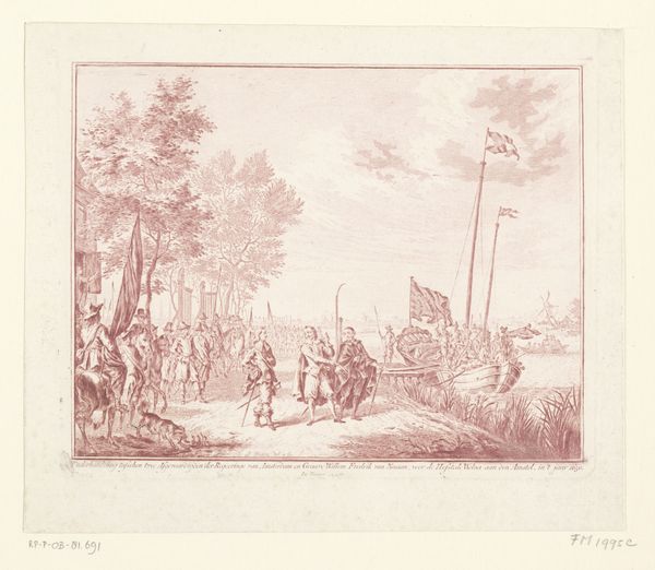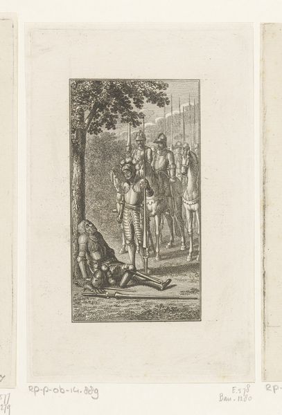 Johann Christoph Erhard created "Huzaren op doortocht" – or Hussars on the March – in etching around the early 19th century. The composition centres on a group of soldiers and horses, rendered with intricate detail through fine, closely spaced lines. The artist uses a restricted tonal range, leveraging the contrast between the stark white paper and the etched lines to define form and texture. The linear quality of the etching enhances the precision of the representation, creating a sense of depth and spatial organization within the scene. The work captures a moment of apparent repose, yet the repetition of figures and the implied movement of those in the background suggest a continuous march, emblematic of military life. Erhard's formal arrangement reflects a broader engagement with themes of order, structure, and the depiction of social hierarchies. He presents a study in contrasts, playing with the ideas of rest versus motion, and the individual versus the collective, thereby encoding complex social dynamics within the seemingly simple scene.