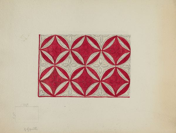 Curator: What strikes me immediately is how joyful this piece feels—it's a burst of color. Editor: Let's dive in. Here we have LeRoy Robinson’s “Quilt,” likely created around 1938. Robinson appears to be documenting a specific textile with this watercolor and ink drawing. What intrigues me is the explicit labor embedded, the capturing of material, form and pattern. Curator: The use of watercolor to mimic textile is rather uncanny; one can feel the push-pull of color and texture. It's easy to see the work existing at the intersection of Regionalism and American folk art. Does its inherent domesticity impact its presentation and interpretation? Editor: Precisely. It raises essential questions about value: who ascribes worth, and to what end? We see here the tension of high and low art, the commodification, perhaps even the "elevation", of craft by capturing it through a considered drawing. Notice, how watercolor—traditionally a fine art medium—imitates textile; the domestic sphere being brought onto the traditionally male world of the easel. Curator: Do you think this drawing then becomes a sort of record—a mode of preservation through art-making that memorializes folk traditions of the American Southeast? Its date situates it during the end of the depression. Did this mode of artistry bring new cultural capital? Editor: I'd suggest that understanding how and why it was made brings even more layers for the viewer to appreciate. This quilt design, rendered in watercolor, asks us to look closer at labor, skill, and context: an intersection where beauty meets the social reality of its creation. In my reading, this interplay makes for a surprisingly complex work. Curator: The drawing presents a quaint exterior at first glance, but thanks to this materialist perspective, we now grasp the web of societal forces subtly captured in it, making it a poignant cultural document of a moment in history. Editor: Exactly. It's through material investigation that we appreciate its value as social commentary—Robinson capturing craft to give it value on the open art market. Curator: What I will keep thinking about are all of those unknown makers and the long hours it took to cut and assemble their craft and how those makers impact the world of arts as a whole.