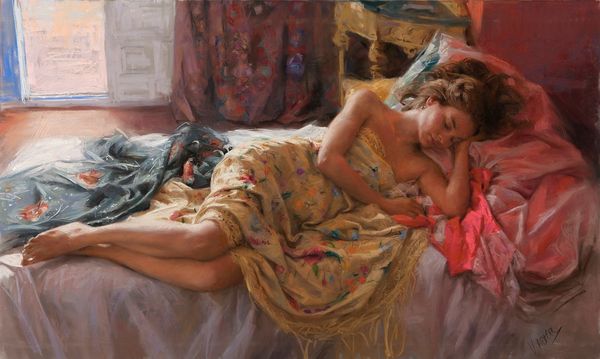 Pino Daeni painted 'Pinodaeni 1' with a style that evokes a sense of intimacy. The woman, absorbed in her book, embodies a motif that dates back to antiquity—the solitary figure in contemplation. The act of reading itself is a powerful symbol. It signifies not just literacy but a personal journey into knowledge and self-discovery. It links us back to images of saints and scholars poring over manuscripts, where reading was a gateway to divine wisdom. Notice how the woman's posture is one of relaxed concentration. This posture echoes through art history, from depictions of Mary Magdalene reading, to the many reclining Venuses, each hinting at inner thoughts and emotional depths. The flowing gown, a common motif in Daeni's work, adds to this feeling of serenity. It is suggestive of classical drapery, and evokes the ideals of beauty found in ancient Greek sculptures. This interweaving of classical elements and everyday life speaks to our shared human experience across centuries. It is a subconscious connection to the values of the past, a deep, unspoken narrative that resonates with our own quest for understanding and peace.