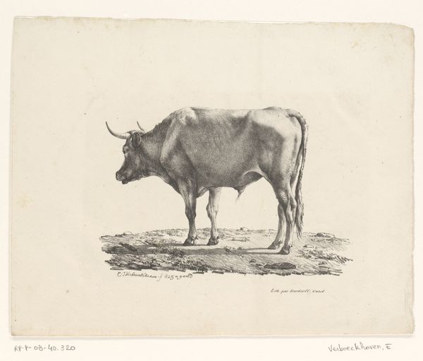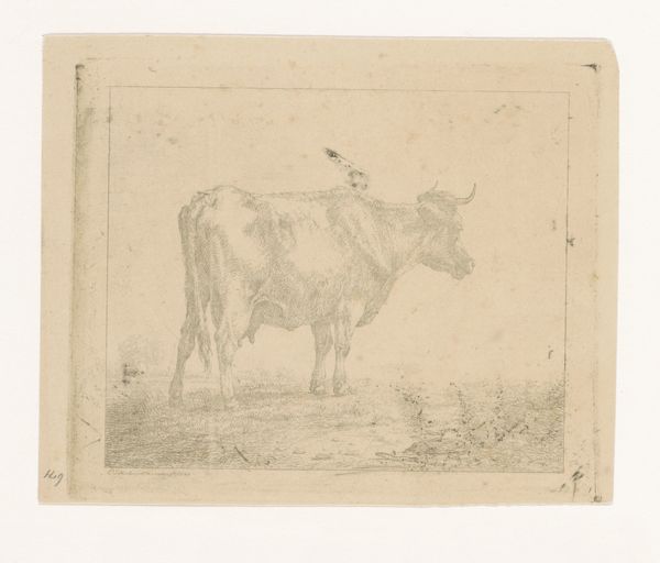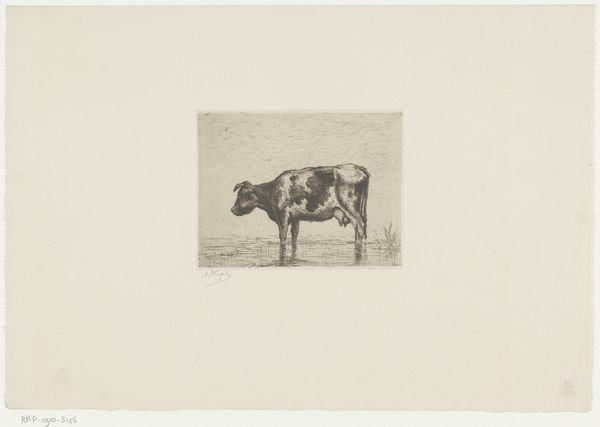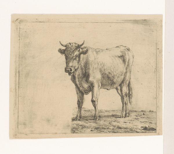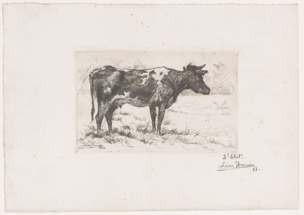 Auguste Danse created this etching of a bull in a field, sometime in the late 19th century. Consider the pastoral settings that were often idealized during this period, frequently presenting harmonious views of nature and rural life. Danse, working within this tradition, subtly challenges it. His bull is not part of a picturesque farm scene, but stands alone, almost confrontational. The starkness of the etching emphasizes the animal's physical presence. The bull, a symbol of virility and strength, here seems almost burdened, its heavy form rendered with a palpable sense of weight. Perhaps Danse is commenting on the labor and the role of animals in agriculture. The print invites us to reflect on our relationship with the natural world, and the complex ways we assign meaning to the creatures within it. It prompts us to consider the realities of rural existence, beyond idealized representations.