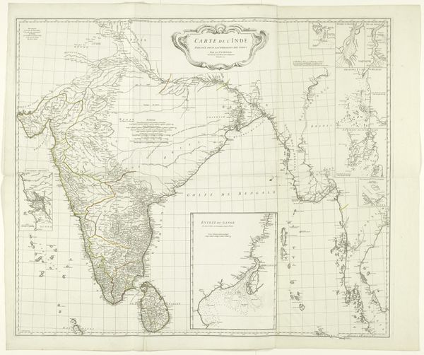 Jan Barend Elwe created this map of South Asia, now held in the Rijksmuseum, using engraving techniques. The structure of the map is immediately striking, with its delicate balance between the landmasses and surrounding seas. The various regions are delineated by soft pastel hues of pink, yellow, and green, creating a patchwork effect that is both informative and aesthetically pleasing. The use of line is particularly noteworthy. Fine, intricate lines define the coastlines, rivers, and borders, giving a sense of precision and detail. This cartographic representation is not merely a neutral depiction of geography; rather, it is a constructed image that reflects the contemporary European understanding of South Asia, colored by colonial interests and cultural perceptions. The act of mapping itself is an assertion of power. Consider the way place names and political divisions are inscribed onto the land, turning the physical space into a canvas for imposing a particular order and narrative. This map serves as a reminder that even seemingly objective representations are embedded with layers of ideology and interpretation.
