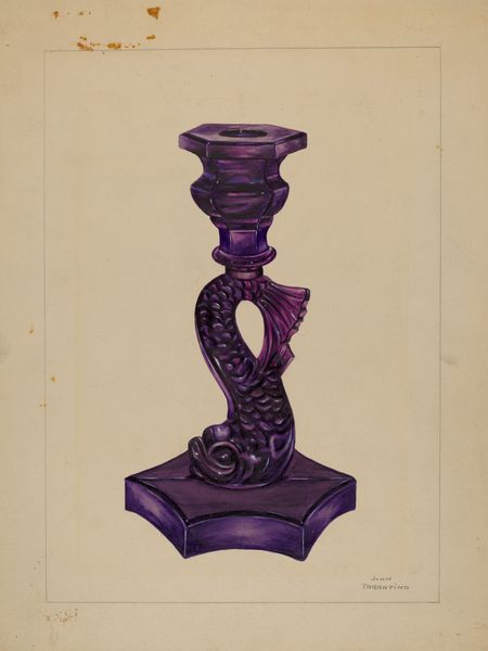 Curator: Here we have "Candlestick," a piece realized around 1936, in watercolor, drawing and painting. It's by Marcus Moran. What's your initial response to it? Editor: Well, it’s surprisingly calming. The monochrome blue, against that stark white background, feels very serene, almost meditative. Yet there's a tension in the geometric base against the sinuous dolphin figure...a fascinating interplay. Curator: Absolutely. Consider the dolphin motif – its roots run deep. In classical antiquity, it symbolized guidance, protection, and resurrection. Christians then adapted the dolphin as an emblem of Christ. Placing it here… it raises questions. Editor: Yes, and considering the social upheavals of the 1930s, the era in which this work was created, that protective symbolism could resonate powerfully. Was the artist seeking to evoke a sense of hope amid instability? Is this object acting as an emblem of something more, promising a spiritual beacon? Curator: Interesting… And I read the work through the objecthood and its geometric grounding: The square plinth at the bottom speaks of earth and permanence, the place that orients us. But look closer; is that plinth floating? There is a suggestion here of the world that supports belief in turn needs support from its adherents. The icon is only as strong as its audience’s commitment. Editor: That's a wonderful point. And what about the stark whiteness around it? Could it represent the daunting, almost overwhelming context of those times? Does that background make the image even more prominent and charged with significance? Curator: It also highlights the object nature of a painted candlestick, and its role to be a ritualistic vessel to house a flame; we tend to revere what helps guide us when times are the darkest. Editor: I think the choice of the aquatic animal has deep historical implications here, its watery domain connects to concepts of emotion, intuition and maybe more. It’s a call to examine our emotions during uncertain times. I think this is what strikes me most about the composition—its delicate interplay between these contrasting yet harmonious design components: that geometric vs curvilinear, the ocean and flames... Curator: A beautiful tension, reflecting the human struggle of striving toward light while standing grounded in the uncertainties of a troubled era. Editor: Yes, ultimately, this simple watercolor offers layers of contemplation relevant even today. A powerful commentary delivered through seemingly simple imagery.