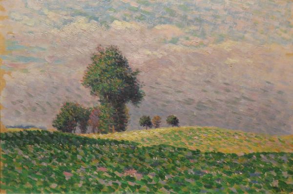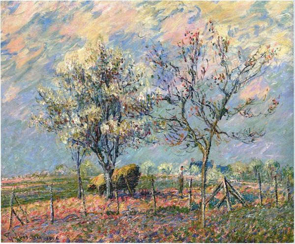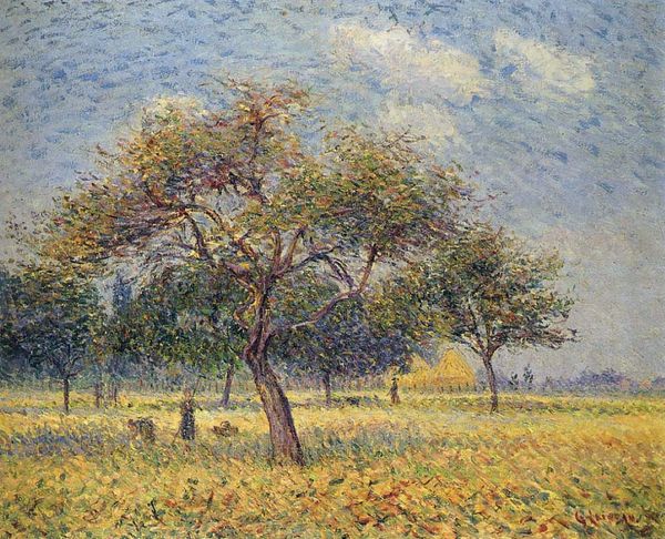 Alfred Sisley created 'The Fields' using oil on canvas, a medium that allowed him to explore the fleeting effects of light and atmosphere. The composition is structured around a series of horizontal planes, from the textured fields in the foreground to the sky above, creating a layered effect that draws the eye through the landscape. Sisley's application of broken color reflects an engagement with impressionist techniques, using small, distinct strokes of pure color to build up forms and suggest the vibrancy of nature. The strategic placement of the trees not only frames the scene, but also creates a dynamic interplay between the solid, vertical elements and the open, horizontal expanse of the fields. The sky, with its fluid brushwork and soft palette, merges form and surface, inviting viewers to immerse themselves in the sensory experience, revealing the rich, complex interaction between perception and representation.