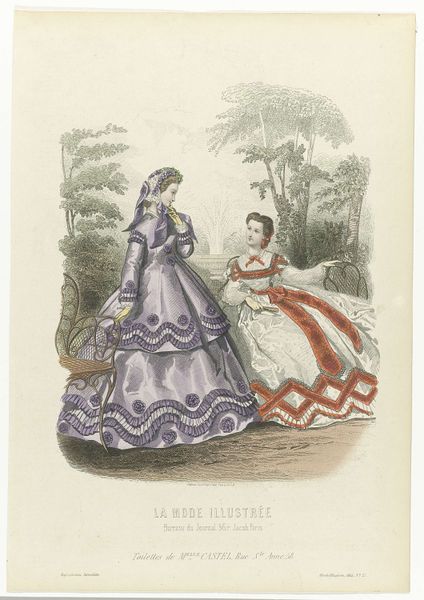 This fashion plate from La Mode Illustrée, printed in 1866, presents us with two figures adorned in the height of Parisian fashion, set against a backdrop of verdant foliage. Note the parasol held by one of the figures. This is more than a mere shield from the sun; it's a symbol of status, a ritual object carried across centuries, harking back to ancient civilizations where parasols signified divinity and power. We see this motif echoed through time, from the ceremonial umbrellas of the East to the canopies shading Renaissance monarchs. The parasol in this image, while seemingly delicate, carries the weight of historical precedent. Its presence engages us on a subconscious level, stirring echoes of past grandeur and societal hierarchies. This is the cyclical nature of symbols. They never truly disappear but resurface, transformed, yet still resonant with their original power.