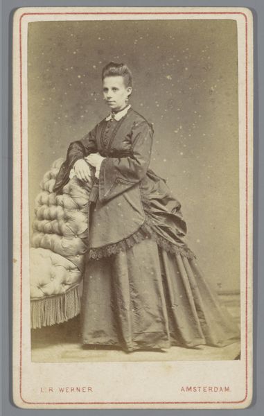 Editor: This is "Portret van een onbekende vrouw achter een stoel" by Albert Greiner, sometime between 1861 and 1874. It’s a daguerreotype, so photography. The sepia tone gives it such an antique feeling, almost dreamlike. What can you tell me about it? Curator: Well, look at the labor involved. The daguerreotype process itself was incredibly complex and painstaking. Think about the craft and the chemicals. Silver-plated copper, polished to a mirror finish, sensitized with iodine fumes... the labor of the photographer but also that of all the tradespeople who made the chair and her garments. Editor: So you’re focusing on the actual creation process. Curator: Precisely! Consider the context. This was the 19th century, and the rise of photography democratized portraiture, moving it away from solely being available to the upper classes with disposable income for commissioned oil paintings. But the sitter is an “unknown woman” of whom? For whom was the luxury and labour spent on photography reserved? What were the working conditions like for women like the one shown, versus men? This portrait represents access but also control of labour by the burgeoning bourgeois, no? Editor: It’s true, that chair and the fabrics do look expensive, maybe suggesting that even 'democratized' access still was determined by societal rank... Are you suggesting there's commentary here on consumption, that it served a capitalist engine for profit and subjugation? Curator: In a way, yes. Her very presence and fashionable, but likely factory made, dress contributes to systems of capital. And let's think about what has become of her representation, used and consumed as an object on display once again here and now. What is seen of value to current audiences versus then? Editor: It's a striking point. I’d never considered how the simple fact of someone being photographed can feed into these much larger, intricate power dynamics of labor and commodities. I'll never look at another daguerreotype the same way.