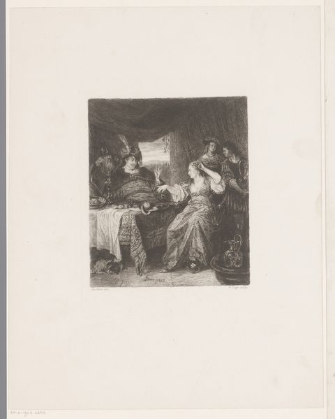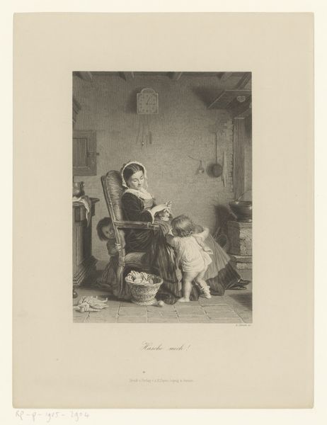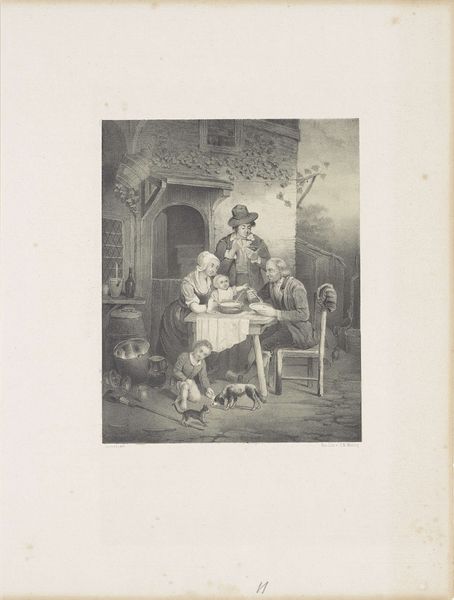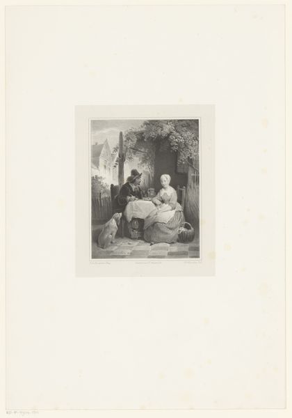 This print, titled "Officier met zijn gezin", was made by Johannes Christiaan d' Arnaud Gerkens in the Netherlands. It's a depiction of domesticity, but within the constraints of social class and gender roles. The officer tends to his wife's hair, while she cradles their child, perhaps signalling a shared sense of responsibility. But the trappings of wealth, the fine clothes and comfortable interior, also speak to a certain level of privilege. It prompts us to ask: What was the public role of art in the Netherlands at this time? How did institutions like the art market and the Royal Academy shape artistic production? And how did artists negotiate their own social positions within these systems? By consulting period documents like salon reviews, artists' correspondence, and economic surveys, we can gain a richer understanding of the social conditions that shaped this image and its reception. The meaning of this art is contingent on its social and institutional context.
