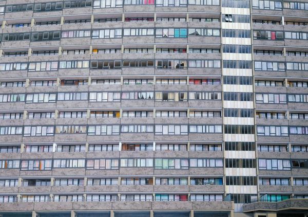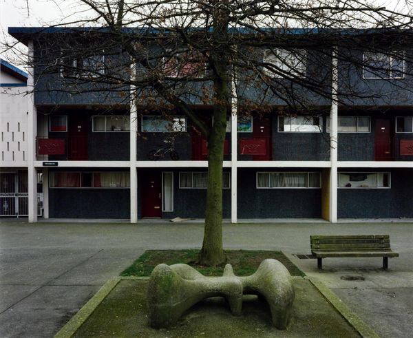 Curator: John Riddy’s photograph, London (Wyndham Road) from 2008, presents a stark view of urban life. The composition, with its repetitive architectural forms, feels almost oppressive. Editor: Oppressive, yes, but also revealing. Riddy's focus on these concrete structures highlights the social realities of urban housing and the impact of material conditions on everyday lives. Curator: Absolutely. The way the light falls, almost uniformly, on these buildings emphasizes their geometric shapes and the sheer scale of the project. It's visually striking, yet cold. Editor: The photograph raises questions about labor, construction, and the political decisions that shaped this environment. It's more than just aesthetic; it's about the lived experience embedded in the architecture. Curator: Perhaps. Ultimately, the photograph invites us to contemplate the relationship between form and function, beauty and utility, in the context of urban development. Editor: I agree, and to remember that this form is not neutral, but rather laden with social and economic implications.
