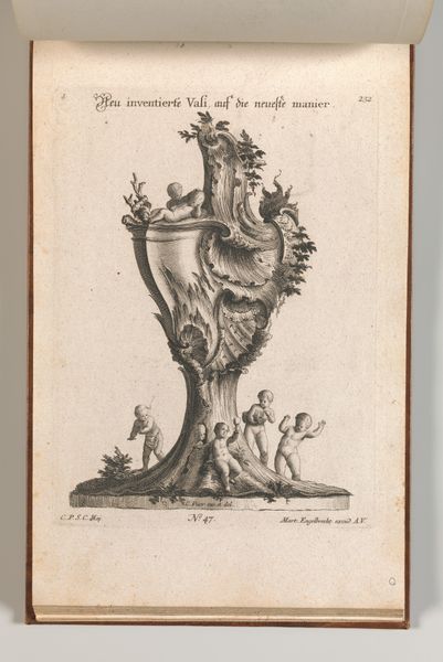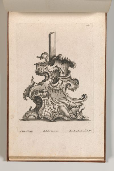 Editor: This is a plate titled "Design for the Base of a Crucifix," dating from between 1745 and 1755, by Jacob Gottlieb Thelot. It’s an engraving, currently held at the Met. I'm immediately struck by the intricacy of the linework and the almost overwhelming detail. It's beautiful, but also feels a little… chaotic? How do you interpret this work? Curator: Chaos, perhaps, but also control. Observe how the elaborate ornamentation, seemingly unrestrained, is nevertheless structured by the underlying geometry of the base itself. The volutes, the vegetal motifs—all are meticulously rendered and contained within a defined form. Editor: So, the ornamentation is almost a kind of language in itself? Like a series of visual statements? Curator: Precisely. Think of semiotics: these motifs act as signs, communicating values of opulence and grandeur, hallmarks of the Baroque aesthetic. Note the strategic deployment of light and shadow, achieved through varied line weights. How does that contribute to the overall effect? Editor: It creates a sense of depth and drama, right? Almost like a stage set. The darker areas emphasize the lighter, more ornate sections. It also reinforces the three-dimensionality of what is, after all, a two-dimensional image. Curator: An excellent observation. Consider too how the artist uses line to create texture. We can almost feel the coolness of the metal, the suppleness of the leaves. The interplay of these tactile sensations engages the viewer on a deeper level. It is line as both structure and surface. What is the symbolic value of such form? Editor: It’s all so calculated and precise, even though it looks free-flowing at first glance. Curator: Indeed. This design transcends mere decoration; it’s a testament to the power of line, form and structure as means of communication. Editor: I never thought about an engraving having such complex architecture. Curator: Analyzing art from this perspective unveils intricacies and strategies we often overlook, broadening our appreciation.