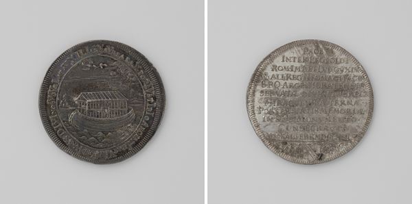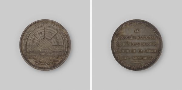 Curator: This striking engraving from 1826 by Joseph-Pierre Braemt captures the "Completion of the prison in Ghent, begun under Maria Theresa." My initial thought is of functionality made monumental, perhaps attempting to impart an image of civic progress? Editor: The severe geometries do give it that sense. Look at the materials, though. It's a print, impressed onto a metal token or medal, likely using an engraving process. What's the story behind the construction of this Ghent prison that warrants such a commemorative object? Curator: Well, construction began under Maria Theresa, illustrating its roots in the enlightened reform movements of the late 18th century, aiming for a more humane and rational system of incarceration. Braemt's engraving, however, comes much later, marking the completion of the project decades after its inception, under a different political regime. It speaks to the long, complex timeline of implementing these large-scale social reforms, and how such projects become intertwined with evolving power structures. Editor: Interesting how the history painting theme is transferred onto this very object; the imagery is fascinating, but how was the token itself, as an object, intended to be used, exchanged, and distributed? Its value resided perhaps not in its metal content but rather in its capacity to circulate a particular narrative about governance. Curator: Exactly. Consider the broader context, too. The creation and distribution of such commemorative items served to solidify and broadcast the legitimacy and benevolence of the ruling authorities. The prison itself becomes a symbol—a tangible manifestation of justice and order as envisioned by those in power. The act of creating and circulating this image, therefore, underscores the complex interplay between art, politics, and the shaping of public opinion. Editor: Yes, but also it invites us to think about those less celebratory perspectives. To produce these images on a material scale necessitates labor, the mines from which the metal was sourced. There is an entire industrial element—an economy of production, reproduction, and exchange. Curator: It definitely encourages reflection. The creation of art is rarely divorced from societal ambitions and historical circumstances, so I do agree, looking closely really unveils the many interwoven elements present. Editor: Indeed, that prison went up as a mark of governance, an assertion materialized and pressed in metal for posterity. And the means used to circulate its image further embedded it within webs of societal function and messaging.