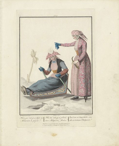 This hand-colored engraving by Ludwig Gottlieb Portman depicts two women in traditional dress and was likely made in the Netherlands in the early 19th century. It offers a glimpse into the economic and social lives of women in the coastal town of Scheveningen. The image creates meaning through its detailed depiction of clothing and objects. The fishmonger's attire, with its distinctive hat and baskets, visually signifies her occupation and social standing. The engraving medium suggests that this image was created for circulation among a middle-class audience interested in the lives of ordinary people. The accompanying text gives the image context and suggests an awareness of class and perhaps even inequality. To understand the artwork better, scholars might consult historical records, such as trade statistics, local histories, and costume studies. By examining this and similar images in their social and institutional context, we can better understand the role of art in documenting and shaping perceptions of everyday life.