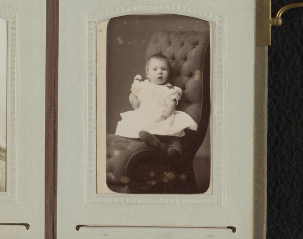 Editor: This is a gelatin silver print, dating from around 1890 to 1910, by Albert Greiner. It's titled "Portret van een baby op een stoel," or "Portrait of a Baby in a Chair." There's a somber stillness to the image; what draws your eye when you look at this photograph? Curator: The gaze of the baby, for sure. It’s unsmiling, direct, and even seems a bit burdened, doesn't it? Consider the historical context: infant mortality was much higher then. Photographs, particularly portraits, served as a way to memorialize a child, preserving their image against an uncertain future. Does that change how we perceive the photograph's "stillness?" Editor: It definitely adds a layer of meaning. It’s more than just a cute baby picture. Curator: Exactly. The formal setting – the elaborate chair, the baby's clothing – it's staged. It hints at societal expectations placed upon even the youngest members of society, marking the child as an individual while simultaneously displaying them within a constructed ideal of bourgeois innocence. Consider too that in this era, gender roles were strictly enforced from birth through dress, decorum, and societal expectation. What kind of conversation does it spark about how we perceive childhood then, versus childhood now? Editor: That’s so interesting! It prompts me to reflect on how much social constructs have changed – or haven't changed – regarding children. Seeing it as more than just an innocent baby picture transforms the photograph into social commentary. Curator: Indeed. The act of photographing a child becomes more than a simple snapshot. It transforms the portrait into a statement. Hopefully you see how even this simple portrait serves as a time capsule to see past ideologies. Editor: Absolutely, and it makes me curious to examine other seemingly simple images with a new perspective.