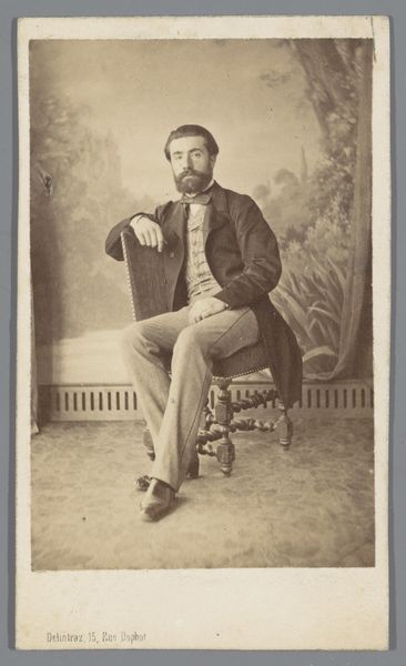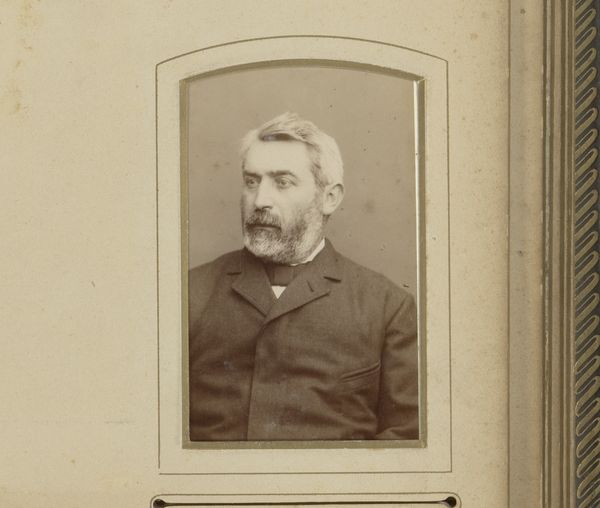 Curator: This is "Portret van een zittende man met snor en baard", a gelatin silver print from sometime between 1860 and 1900. Editor: It has a lovely, melancholic air to it, almost sepia-toned despite being a silver gelatin print. The way the light catches his face… It’s quite evocative. Curator: Note how the photographer utilized a limited tonal range to subtly model the sitter's form. This monochromatic palette focuses our attention on the subtle variations of light and shadow, lending the piece its understated gravitas. The man’s gaze confronts us directly. Editor: That gaze, it strikes me, embodies a complex mix of weariness and resilience. Consider the social constraints of the era—what freedoms, or lack thereof, might have shaped his world and demeanor. The beard, meticulously groomed, speaks of a certain social standing, but the eyes hint at a deeper narrative, perhaps of struggles and expectations. How was masculinity defined at that moment in time? Curator: Intriguing points. The formal composition, with its careful arrangement of figure and ground, however, speaks to the influence of academic portraiture. Observe the framing—the deliberate cropping and positioning of the sitter creates a sense of restrained elegance, quite proper, according to accepted models of representation. Editor: Elegance is apparent, though in our contemporary view, can’t we see it less as "restraint" and more as enforced decorum? Doesn’t the clothing also hint at economic status, reminding us of the vast inequalities of the period? We must ask ourselves, whose stories are told, and whose are left unheard within these images? Curator: Indeed, such questions provide critical interpretations that challenge the dominant modes of appreciation. The success of this piece exists in how these formal components contribute to a unified, aesthetic experience. The use of light to delineate form, the nuanced interplay of shadows... Editor: It encourages a conversation beyond aesthetics, revealing much about societal power structures. It gives me cause for reflection regarding our inherited narratives. Curator: An appropriate conclusion to draw, encouraging further dialogue beyond the art historical timeline. Editor: I fully agree. These conversations give works lasting vitality.