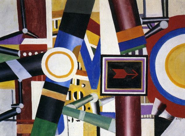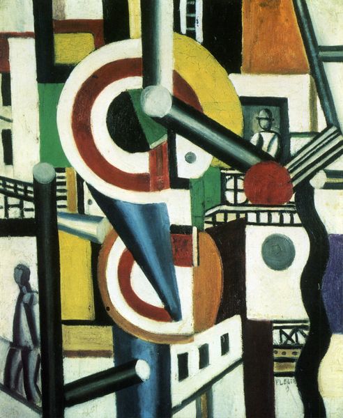 Curator: Fernand Léger’s “The Stove,” painted in 1918, is an explosion of color and geometric form. What’s your initial read on this work? Editor: Disorienting, immediately. A bombardment of shapes. But strangely, there's a tactile quality here, a sense of implied textures and implied movement in an industrialized context. Curator: Léger was deeply engaged with the modern industrial world. Semiotics would suggest that the geometric forms aren’t random but are stylized depictions of machines and architecture. The overlapping planes create a dynamic tension, reflecting the dynamism of urban life. Editor: And painted so shortly after the devastation of World War One, how might Léger be reconciling machine-made objects, now associated with mass slaughter, with the recovery of a war-torn society? Were such paintings optimistic in tone, a look to the future, or warnings about humankind’s reliance on destructive war machines? Curator: An astute observation. Léger’s post-war work explores that ambivalence. In “The Stove,” the stove might symbolize domesticity, but its sharp lines, combined with industrial motifs, question the traditional dichotomy of home and factory. We can look closely at how his style employs both angular and curving shapes for balance, which he called " contrasts of forms.” Editor: The contrasting black and white elements arranged close to brightly-colored geometric planes feel jarring. Léger is playing with binaries. The checkerboard near softer lines seem as though traditional, familiar motifs can sit—somewhat uncomfortably— alongside the chaos of modern mechanized forms. Curator: The painting also challenges the conventional use of perspective, thus creating a unique viewing experience, an invitation to embrace ambiguity. Léger himself explained that one should “see the object, not its reproduction.” Editor: Considering the politics and rapid social change happening across Europe at the time, it makes sense he may be suggesting, through this work, to focus less on strict representationalism and, instead, embrace progress—though tentatively. Curator: So we might view the artwork through the lens of the socio-political issues that permeate, using them to consider and reflect upon art in modernity. Editor: Exactly, to move past just analyzing how something is shown, to interrogate what is actually being said.