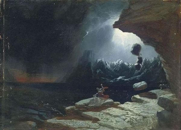 Curator: Oh, this is affecting. Wright's "A Grotto in the Gulf of Salernum, with the figure of Julia, banished from Rome," painted in 1780. Look at that chiaroscuro! Editor: My goodness, the sense of utter isolation is palpable. A single, frail figure amidst the imposing darkness of the grotto. Curator: Indeed. The dramatic lighting—a hallmark of Wright's style—guides our eye, doesn't it? The stark contrast between the inky blackness of the cave and the almost ethereal light emanating from the sea...it’s incredibly deliberate. The painting employs light not only to reveal form, but to create a moral narrative about emotional strength. Editor: One has to wonder, however, about that figure. Julia, exiled—a woman deprived of power, made to inhabit a lonely periphery. And, of course, we have to remember the conditions for female artists at that time—was there an empathy towards women in socially vulnerable positions, a silent protest against restrictive cultural structures? Curator: The grotto itself becomes almost a character in this scene, a framing device almost. Consider the sharp, angular rocks against the fluid, almost luminous quality of the water. There’s a clear formal tension between stability and change, the temporal versus the eternal. The emotional register here is palpable in the forms. Editor: True. The way Wright positions Julia, almost as a tiny supplicant before a vast, indifferent nature, speaks volumes. Her banishment from Rome reflects more than just a personal tragedy. Curator: The narrative weight it carries, filtered through its structure—the interplay of light and shadow, the textural contrasts—makes it a prime example of Wright's unique Romantic vision. He doesn’t offer sentiment, but rather, shows its construction. Editor: So, we see Julia not only as a woman in exile, but as a symbol—or maybe a warning—about the precariousness of power and the social constraints. Wright turns the personal into the political. A woman's private despair turns into public spectacle of power at play. Curator: Yes, indeed. Thinking purely in structural terms it all just serves to accentuate the overall design! Editor: Thank you, both Wright and you, for giving us a fresh look into this period, and the stories that live beyond a canvas.