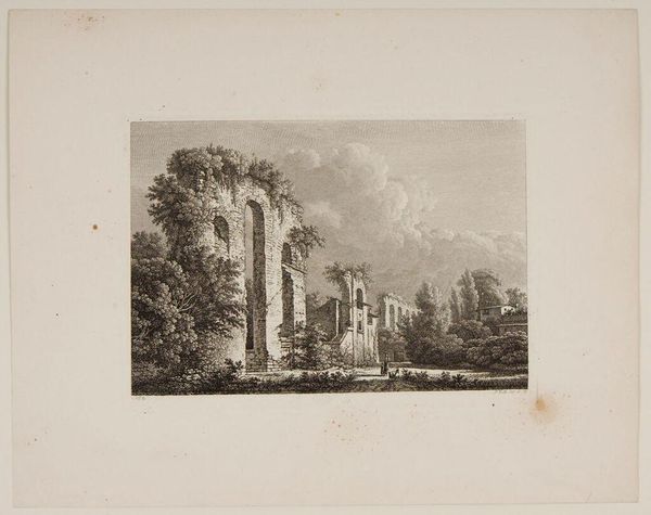 Curator: Philipp Veith created this engraving, "Overwoekerde ruïnes nabij Rome en een vrouw met kind en twee geiten," around 1822. Editor: There’s such a pervasive sense of melancholy about it; the softness of the tones paired with the skeletal ruins. It's compelling. Curator: Absolutely. Think of the cultural fascination with Rome in the Romantic era, the weight of its history bearing down, visible in every crumbling brick. And the subtle social dynamics, here we find a family group, perhaps rural peasants, now dwarfed against the background of empire. The interplay between these symbols – history and domesticity – presents fascinating insight. Editor: The medium really reinforces that feeling, doesn't it? The delicate nature of an engraving, laboriously produced, to depict such a grandiose, but decaying, architectural presence. One questions the production, the need for such material labor and distribution, for the sake of spreading this rather bleak visual and moral statement. Curator: Precisely, and through a feminist lens, observe how Veith positions the woman, likely a mother. The ruin behind them—are they also, metaphorically, in decline? Are the burdens of history and social expectation disproportionately on their shoulders? Editor: Interesting how the means of reproducing images become more accessible around this period, making them tools for wider dissemination. Yet here we find the artist focused on something crumbling. It challenges one's assumptions about progress, really making one interrogate notions of utility. Curator: It makes us reconsider what histories and whose lives are worth remembering. Who is being preserved through these material objects, what values is Veith reflecting? The act of remembrance itself is deeply rooted in social privilege. Editor: Right. We look at it now through a lens of class and see it as an artefact representative of leisure culture. And though we speak now of its cultural significance and read deeply into gender roles, its material significance resides in how the work itself was spread and interpreted then—not just as high art. It truly encompasses this period, through process, depiction, and content. Curator: Definitely, I agree. Considering what we have looked at, the many lenses this artwork touches: the role of labor, and material, and identity... This engraving captures the complexity of romanticism beyond its simplistic label, which can encourage many social and material understandings about Europe at the time.