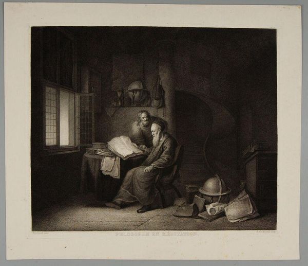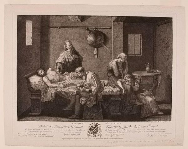 Curator: Good morning. Today we’re observing Jean Pelletier's etching, "The Anger of the Drunkards." Editor: It’s a chaotic scene, isn’t it? The composition is quite arresting. It feels like a frozen moment of drunken frenzy, almost a glimpse into a societal ill. Curator: Indeed. Notice how Pelletier uses light and shadow to amplify the emotional weight of the image. Observe the symbols: the overturned jug, the hayloft, the barely suppressed violence. These are all clues. Editor: The material conditions implied here are stark. We see the rough textures of the rural setting. The image shows a group grappling, likely commoners. The means of production, etching, makes it reproducible, accessible, and perhaps politically charged. Curator: Perhaps. The image carries a strong cultural memory of the dangers of moral decay. Editor: It serves as a testament to the labor involved in its creation and the societal context that birthed it. It is definitely something to contemplate.