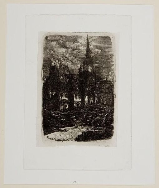 Curator: This is "S. Séverin," an etching by Alfred Taiée, housed right here at the Harvard Art Museums. Editor: It has a rather claustrophobic feel, wouldn't you say? The buildings loom so tall, pressing in on that narrow street. Curator: Indeed. The print captures a medieval streetscape, likely aiming to evoke the past's weight on contemporary society through its architecture. Editor: The stark contrasts and the density of the lines add to that feeling, don't they? The cobblestones almost vibrate with texture. Curator: Certainly. The artist may have been commenting on urban life and its constraints, common in the late 19th-century art milieu. Editor: It's a somber piece, technically skillful though. Makes me think of how the past shadows our present. Curator: A potent reminder of how built environments shape our experience. Editor: Yes, I think it’s a fine example of creating space through the management of tone.